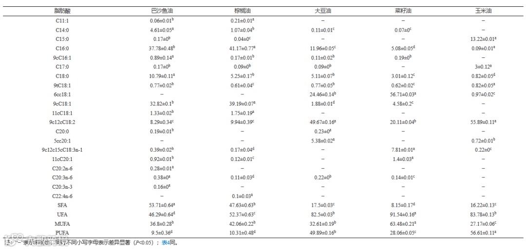 表 3 五种食用油的脂肪酸组成及含量(%)