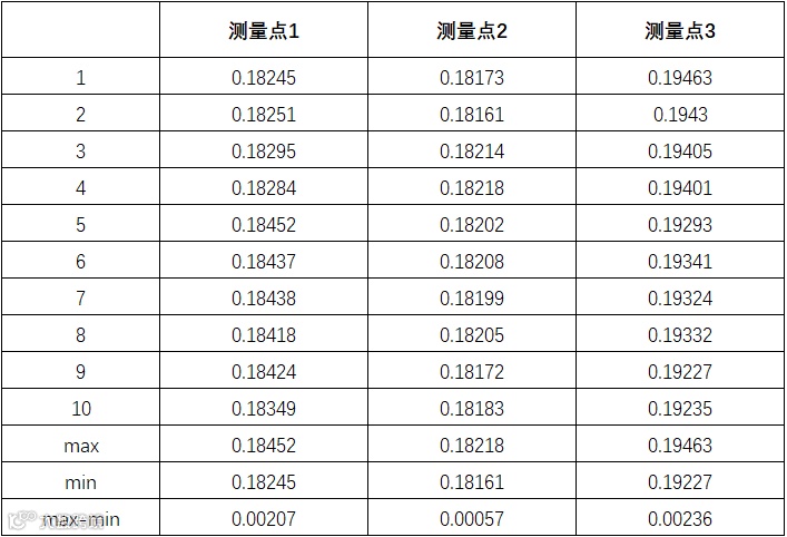 数据说明:10次静态测量,测量三个点的重复性分别为0.00207mm、0.00057mm、0.00236mm,测量数据满足精度要求。