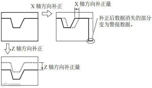 原始轮廓既可以进行X轴方向反转和Z轴方向反转,也可以进行X轴方向补正和Z轴方向补正,补正后数据消失的部分变为警报数据。