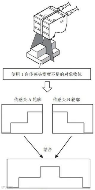 当1个相机无法在X方向上完全扫描一个物品时,可以使用两个相机扫描同个物品,并把两个相机的轮廓合并成一个进行处理。