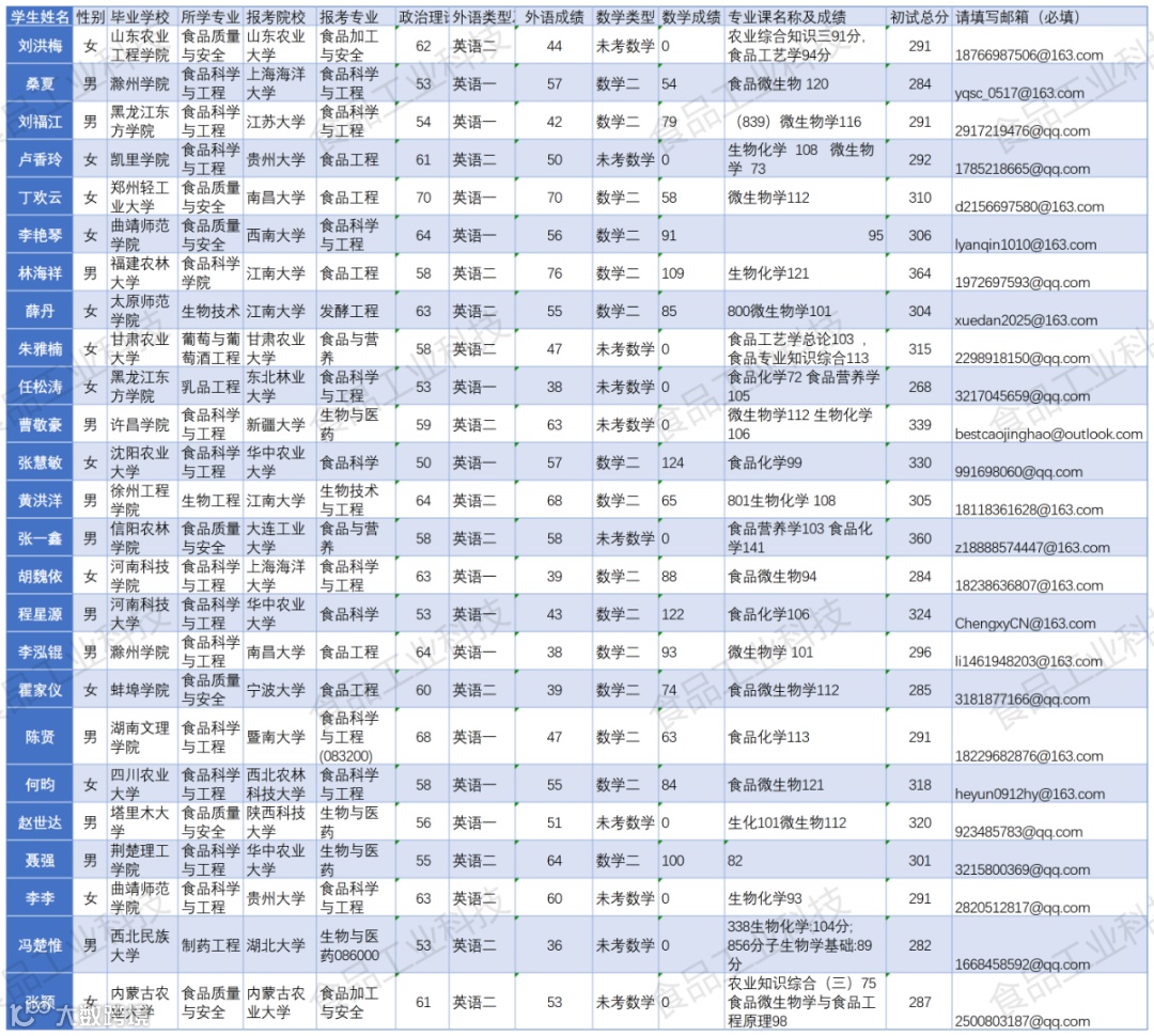 《食品工业科技》公益助力学生研招,图片显示度不佳,点击文末“阅读原文”或登录《食品工业科技》官网www.spgykj.com-考研调剂版块下载Excel版学生信息。图中隐去了学生的部分信息及电话,如有需要,请联系我们: