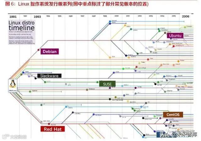 Linux 系统版本之间存在衍生关系,由此形成 RedHat、Slackware、Debian 等几大家族,各家族 内部又衍生出一些著名版本,如 Ubuntu、SUSE、CentOS、Red Hat Enterprise Linux、Fedora 等。