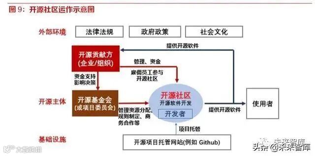 许多开源社区背后都有一个主导企业,为社区提供资金和研究支撑,甚至直接委派员工参与开源 项目。例如,Fedora 社区的核心开发者中 1/3 是红帽的正式雇员。通过资助和维护开源社区的方 式,企业可以发挥研究力量的“杠杆”作用,通过向社区输入自有的研究资源,吸引更多的外部贡 献者参与进来,扩大创意来源;另一方面,开源社区版本也成为企业扩大技术影响力的重要途径。