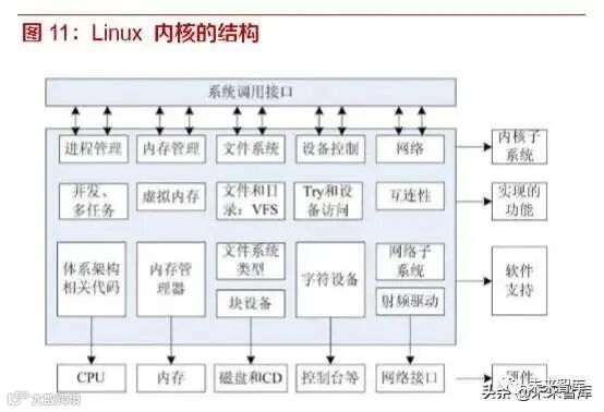 Linux 操作系统由 4 部分组成:kernel、shell、文件系统、应用程序。Kernel(内核)是操作系统的 核心,不同于 windows 的内核,Linux 的内核不仅实现了进程调度、内存管理、中断处理、异常陷 阱处理,而且还实现了进程管理、进程通信机制、虚拟内存管理、文件系统驱动和 USB、网络、声 音等各类设备驱动子系统,决定了整个系统的性能和稳定性。而 shell 是系统的用户界面,提供用 户与内核交互的接口,接收用户输入的命令并送入内核去执行。