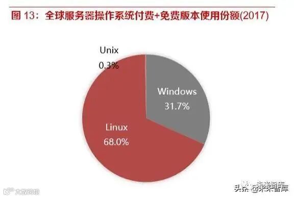 Linux 操作系统主要的优势领域是服务器和嵌入式。据 Linux 基金会统计,全球 90%的公有云平 台采用了 Linux 系统,99%的超算和 62%的嵌入式设备也都是基于 Linux。亚马逊 AWS、微软 Azure、微软 Azure、谷歌云平台和阿里云等主流云服务商,都提供了 Linux 系统方案。全球公有 云平台运行的所有应用,超过 54%是运行在 Linux 虚拟机上。甚至微软 Azure 的近 30%的虚拟机 也是基于 Linux。根据 IDC 在 2017 年的统计数据,全球服务器操作系统使用份额(免费+付费)中, 68%是 Linux 服务器操作系统。