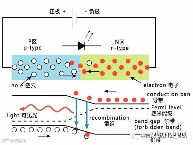 ▲LED发光原理:当电子经过晶片时,带负电的电子移动到带正电的空穴区域并与之复合,电子和空穴消失的同时产生光子。