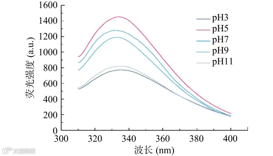 OPI 的荧光峰实际上是色氨酸残基的荧光峰,内源性荧光分析可以反映蛋白质小分子之间相互作用的信息。由图 2 可知,在不同的 pH 条件下,OPI 具有不同的荧光强度。pH 为3 和 11 时,蛋白荧光强度较低,分别为 772.64 a.u.和820.55 a.u.。可能是由于酸或碱处理导致蛋白质变性,色氨酸残基广泛暴露于亲水环境,引起荧光猝灭。当 pH 从 3 增加到 5 时,观察到最大发射波长的红移(从 335.2 nm 移至 334.4 nm 处)。可能是由于蛋白质分子聚集膨胀,减少了内部荧光猝灭。pH 从 7 增加到 11 时,最大发射波长出现明显的蓝移(从 331.4 nm 移至 335.4 nm 处)。这可能是由于酸或碱处理导致蛋白质的三级或四级结构发生改变,色氨酸残基暴露,使得发射波长变大。