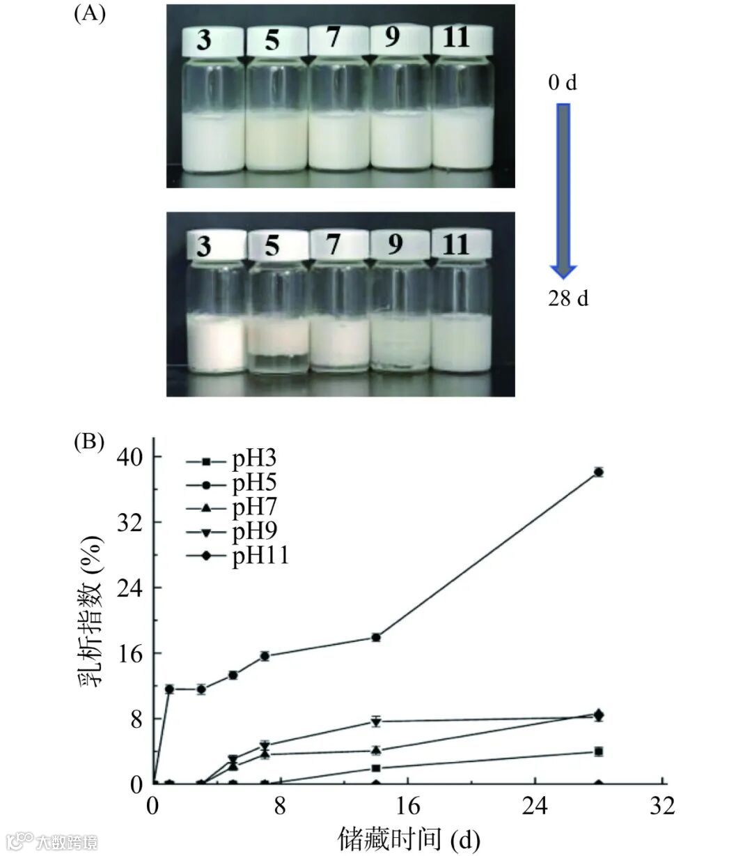 不同体系 pH(3、5、7、9 和 11)下的乳液在0.5~10 Hz 频率下的储能模量(G')和损耗模量(G'')变化如图 9(B)所示。相同 pH 条件下乳液的 G'值高于整个频率范围内的 G''值,表明乳液为黏弹性结构。从整体来看,体系 pH 为 5 的乳液 G'和 G''大于其他 pH 下的乳液。并且随着频率的增加,乳液模量也随之上升。这是由于此条件下乳化剂无法稳定油水界面,较大粒径的乳液对剪切力具有较强的抵抗作用。其他组乳液的 G'和 G''几乎不受频率的影响,表明在整个频率范围内,乳液具有相对较高的凝胶强度。随着体系 pH(3、7、9 和 11)的升高,乳液的模量(G'和 G'')降低。可能是由于乳液表面电荷增加、粒径较小,导致凝胶强度降低。