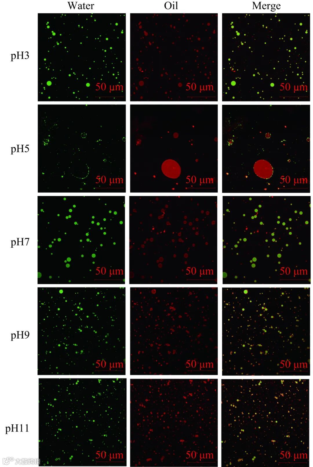 通过激光共聚焦扫描显微镜有助于明确蛋白质颗粒在油水界面处的定位,并判断乳液的类型。如图 7 所示,绿色的油滴外均匀的吸附了一层红色的蛋白颗粒,表明形成了稳定的水包油 Pickering 乳液。Zhang 等的研究与此结论一致。随着体系 pH 的增大,乳液的粒径先增大后减小。体系 pH 为 5 时,蛋白表面电荷较低,颗粒粒径较大,溶解度较低。形成的乳液液滴分布不均匀,尺寸不规整,液滴边缘和水相中均存在粒径较大的蛋白质聚集体。不能有效地稳定油水界面。这与溶解度结果相一致。而体系 pH 在 3、7、9 和 11 时,OPI 溶解度较高,Zeta 电位绝对值较大,制备的乳液粒径较小,液滴分布较均匀。水相中的 OPI 聚集体较少,油滴界面均吸附着红色的蛋白膜。表明蛋白有效吸附在油水界面。这些结果表明,酸或碱处理改善了 OPI 稳定乳液的微观结构和液滴分布。