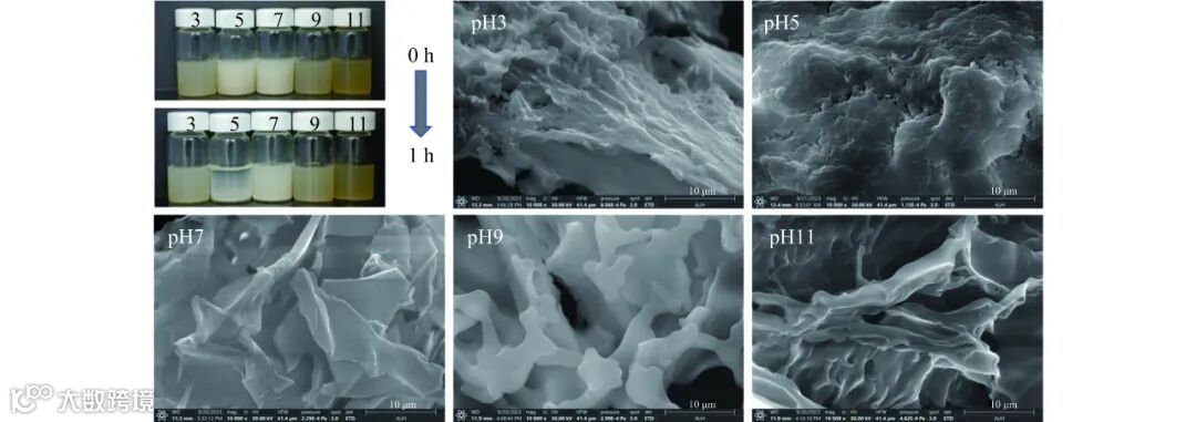如图 4 所示,可以观察到 pH 为 5 和 7 时,悬浊液为乳白色。其他组(pH为 3、9 和 11)的悬浊液呈现不同程度的棕色。这是由于肽键-CONH 在酸或碱的作用下发生断裂,致使蛋白构象发生变化。蛋白质分子的电离状态发生改变,从而导致颜色和沉淀的变化。静置 1 h 后,pH 为 5、7 和 9 的蛋白悬浊液出现不同程度的分层。这是由于溶液的 pH 靠近蛋白等电点时,蛋白溶解度较低,粒径较大,这与上述图 1(A)结果相一致。在不同 pH 下,OPI 的微观形貌存在较明显的差别。在 pH 为 5 时,蛋白溶解度低,颗粒倾向于球形结构,比远离等电点的其他 pH(3、7、9 和 11)处出现更多的纤维结构和更粗糙的表面。这可能是由于在等电点附近 OPI 分子间的静电斥力减小,以颗粒形式聚沉析出。在 pH 为 3、7、9 和 11 时蛋白颗粒形成层状结构,这可能是由于 OPI 在远离等电点的 pH 溶解度较高,从而在干燥过程中形成层状结构。也可能是由于蛋白的 pH 远离等电点时,蛋白质表面的电荷就越多。由于静电排斥较小,带电极性基团的侧链和亚基趋于展开,形成柔性构象。远离等电点时,OPI的亲水基团暴露较多,导致 pH 为 3 和 11 的蛋白显示更多的纤维结构,具有较大的纵横比。