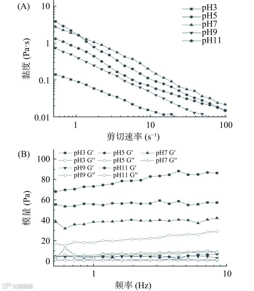不同体系 pH(3、5、7、9 和 11)下的乳液表观黏度如图 9(A)。表观黏度随着剪切速率的增加而降低,表明乳液产生剪切稀化行为。在剪切力作用下,粒子产生流动,乳液粒子的结构被破坏,网络结构弱化,导致这些分子在一定程度上被分离出来。体系 pH 为 5 时,乳液的初始表观黏度最大。这可能是由于乳液粒径大,分子间相互排斥力较弱,颗粒极易凝聚,这些聚合物溶液具有较大的内部阻力阻碍流动。反之,体系 pH 为 3、9 和 11 时,表观黏度较小。这可能是由于远离等电点,蛋白溶解度高,颗粒间静电斥力大,乳液粒径小,分散性好,表观黏度较小。总体来看,在不同 pH 条件下的乳液黏度都较小,乳液流动性较强。