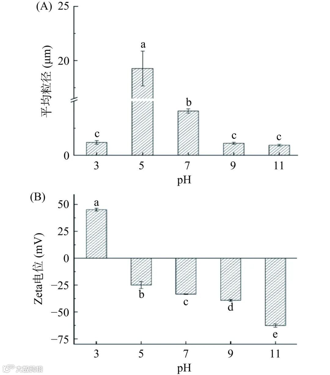 如图 1(B)所示,随着蛋白溶液 pH 的升高,OPI 的粒径先增大后减小。pH 为5 时粒径最大,约 4.14 μm。这可能是由于在等电点附近,蛋白表面电荷几乎为零,液滴之间静电斥力较低,蛋白颗粒形成较大的聚集体,蛋白溶解度降低。pH 为 7 时,蛋白粒径显著减小至 0.55 μm(P<0.05)。pH 为 3、9 和 11 时,OPI 的粒径最小为 0.27 μm,且相互之间无显著差异(P>0.05)。这可能是由于在等电点附近,蛋白表面电荷几乎为零,液滴之间静电斥力较低,蛋白颗粒形成较大的聚集体,蛋白溶解度降低。当溶液的 pH 远离蛋白等电点时,蛋白分子间的电荷数增多,分子之间的静电斥力增加导致蛋白分散,溶解度升高,这与图 1(A)结果相一致。