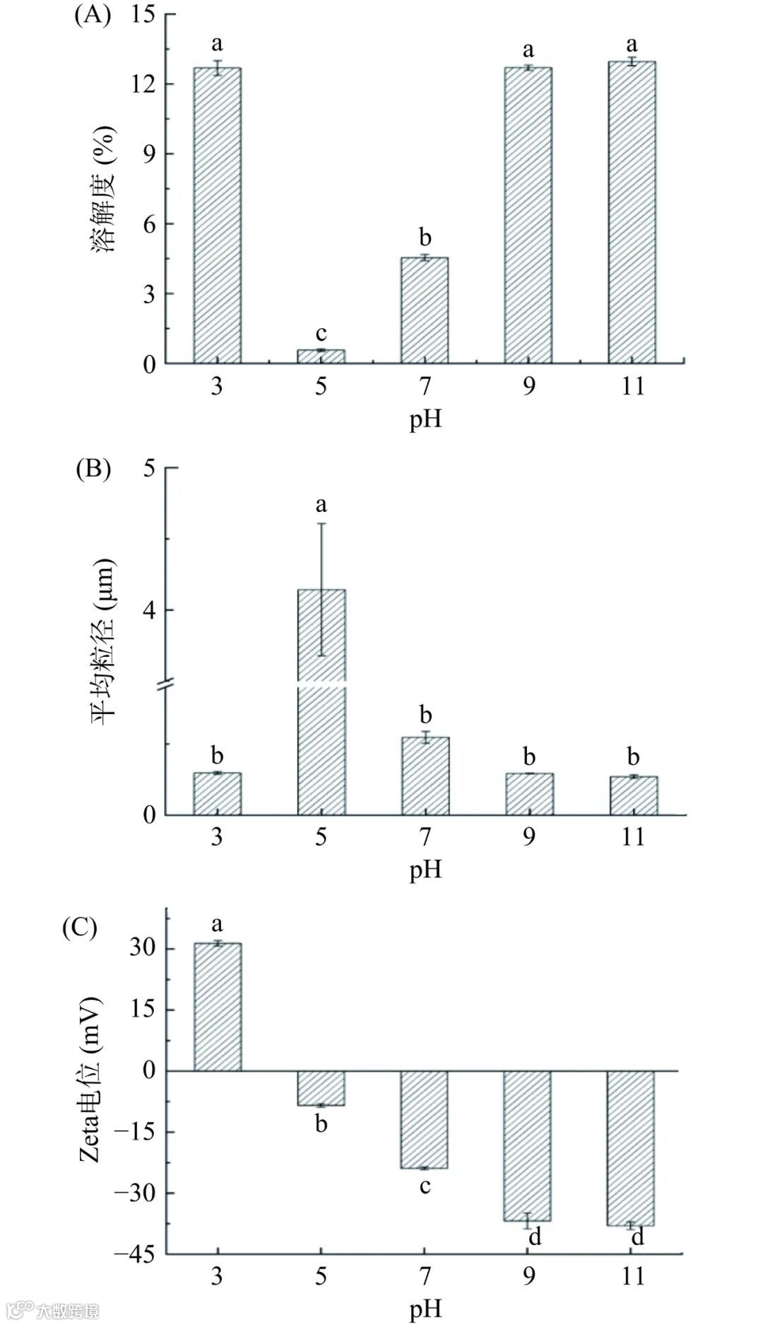 不同 pH(3、5、7、9 和 11)下 OPI 的溶解度如图 1(A)所示。pH 为 5 时,OPI 的溶解度低至 0.57%±0.05%。这可能是由于蛋白质在等电点附近,表面净电荷接近于零,分子相互之间的静电斥力小,颗粒碰撞后发生絮凝,产生沉淀,溶解度小。pH为 7 时,蛋白溶解度为 4.54%±0.13%,pH 为 3、9 和11 时,OPI 的溶解度显著升高(P<0.05) ,最高约12.96%。这可能是由于远离等电点时,酸或碱处理破坏了 OPI 聚集体,使 OPI 颗粒能够更好的分散。在水溶液中,OPI 表面积较大,从而增加了水-蛋白质相互作用的能力,能够更好地水合。也可能是酸性或碱性环境导致 OPI 的结构展开,提供了更多的水结合位点。张庆等的研究中,pH 下降使大分子蛋白质解聚,二硫键断裂,OPI 的溶解度增加。