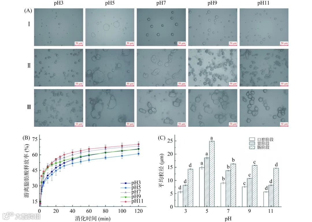 不同体系 pH(3、5、7、9 和11)下的乳液的体外消化结果见图 11,乳液的微观状态变化趋势基本一致。三个阶段乳液的粒径均有不同程度的增大。在口腔阶段,乳液液滴均没有明显变化,这可能是由于在模拟口腔阶段的时间相对较短。胃部消化结束时,乳液液滴部分被分解,消化液呈淡黄色,液面未见大油滴漂浮,粒径稍有增加,乳液液滴开始破裂。这是由于在模拟胃液中,乳液受 pH、酶和盐离子浓度的影响。也可能是存在的强酸和胃蛋白酶对蛋白质界面层造成了一定程度的破坏。肠消化阶段,体系 pH 会在较短时间升高到 7 左右。乳液液滴表面会带大量负电荷,其静电排斥作用增强,油相和 OPI 发生明显分离。这可能是肠道中的胰酶渗透到微粒中,导致其界面层受到侵蚀,油相不能被很好的覆盖和保护。小肠消化结束时,乳液粒径明显增加。