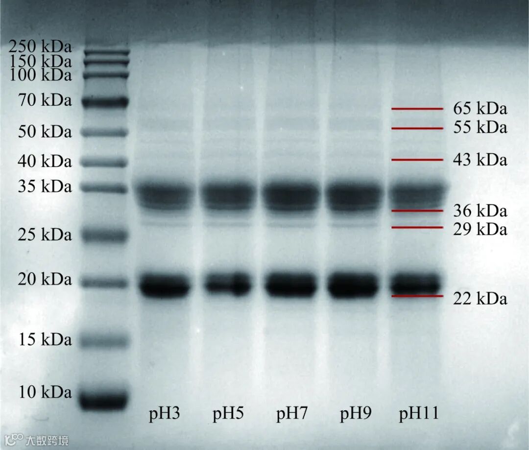 不同 pH 下 OPI 的电泳图谱如图 3 所示。OPI 在 15~75 kDa 之间有 6 个条带。36 kDa 和 22 kDa 条带分别对应 12 S 球蛋白的酸性亚基与碱性亚基,该蛋白是 OPI 的主要储藏蛋白。吴寒等的结果中,OPI 泳道的条带集中在27.76~35.08 kDa 和 21.18~23.83 kDa 之间,这与其他学者的研究结论一致。其中 65 kDa 和 55 kDa可观察到的条带是 7S 球蛋白的成分。29~30 kDa对应清蛋白,在 43~50 kDa 之间观察到燕麦谷蛋白亚基。该结果表明提取的 OPI 中主要是燕麦球蛋白和部分清蛋白以及谷蛋白。