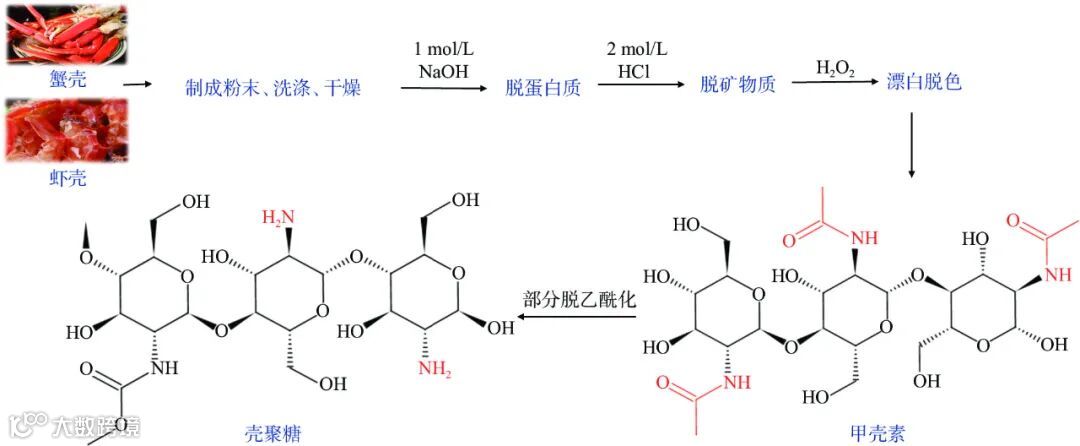 壳聚糖,聚(1,4)-2-氨基-2-脱氧-β-D-葡萄糖,是自然资源非常丰富的线性高分子化合物,一般用化学方法提取获得。壳聚糖的制备流程如图1所示,首先将蟹、虾壳粉浸入NaOH溶液中,洗涤干燥后经脱蛋白、脱矿物质和脱色过程获得甲壳素,甲壳素再经脱乙酰化获得CS。