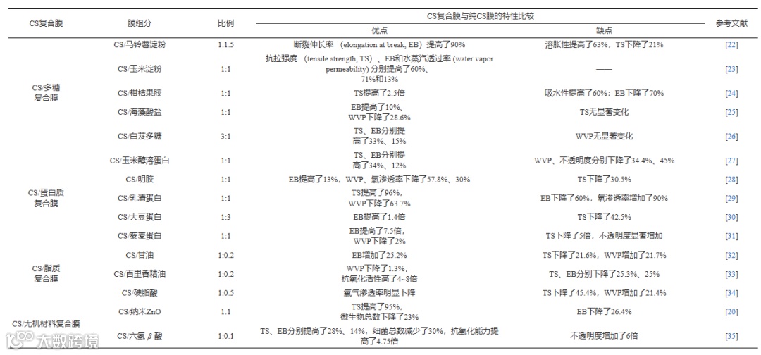 多糖(如淀粉、果胶和海藻酸盐)具有无毒、成本低、来源广泛、成膜性和水溶性良好等优势,可作为成膜组分添加至CS成膜液中,其分子上的活性官能团可与CS分子上的-NH2、-OH、N-乙酰基等官能团通过不同的方式结合,提高复合膜的机械性能和阻隔性能。表1汇总了目前已开发的CS基可食膜的种类并就CS复合膜和纯CS膜的特性进行了比较。
