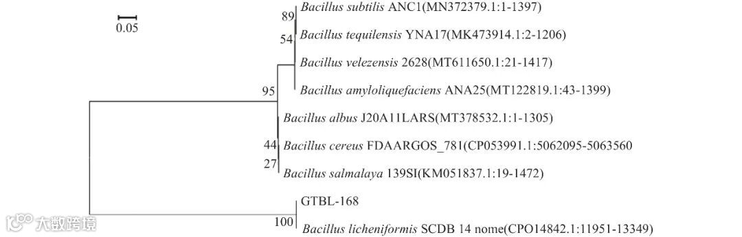注:标尺0.05为遗传距离比例尺,是系统发育树中各分支长度的参照;GTBL-168表示地衣芽孢杆菌168号菌株;KM051837.1:19-1472等均为各菌株GeneBank登录号。