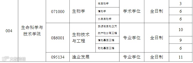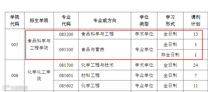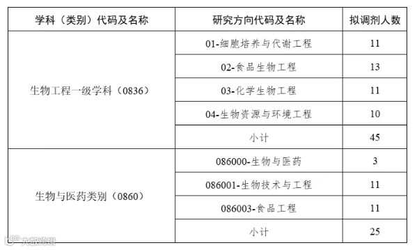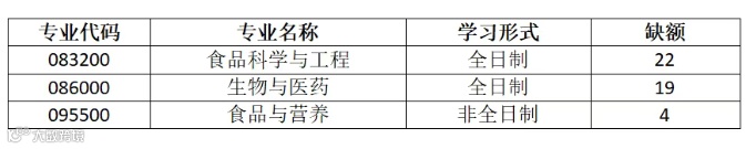 食品科学与工程(学硕083200),9个;绿色食品加工与安全工程(学硕0832J5),3个;生物工程(学硕083600),9个;生物与医药(专硕,086000),6个,学习方式为全日制。