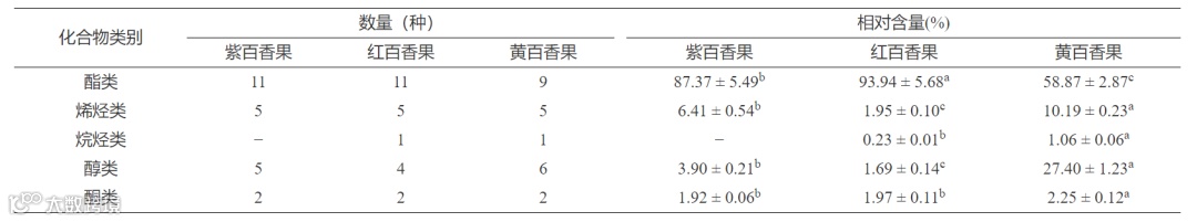 表 2 三种类型百香果果实中挥发性化合物的种类及其相对含量