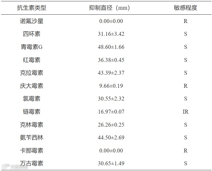注:抗生素药敏性的抑制程度分为R(低敏感性,抑制直径≤14 mm)、IR (中等敏感性,抑制直径15~19 mm)、S(高敏感性,直径>20 mm)。