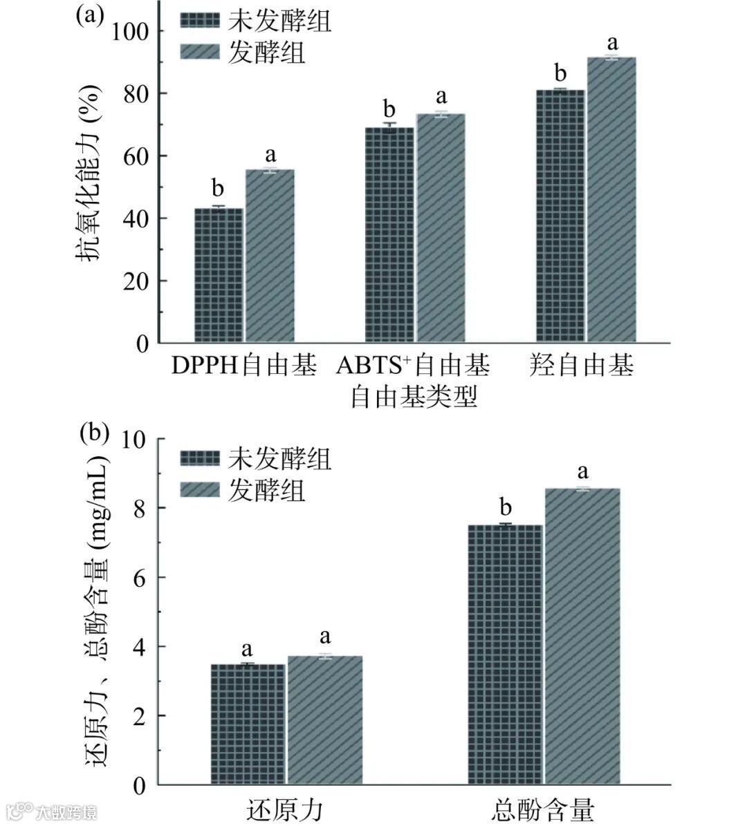 注:(a)自由基清除能力;(b)总酚含量与还原力;同一指标不同小写字母代表有显著性差异(P<0.05)。