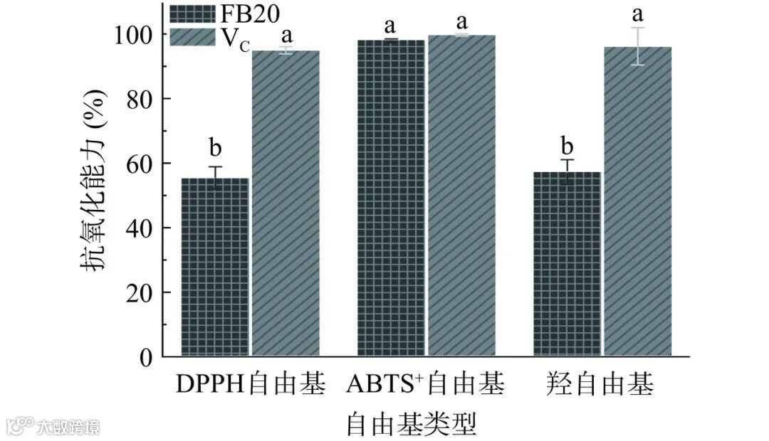4. FB20菌株的无细胞上清液具有抗氧化性,对ABTS自由基的清除能力最强。