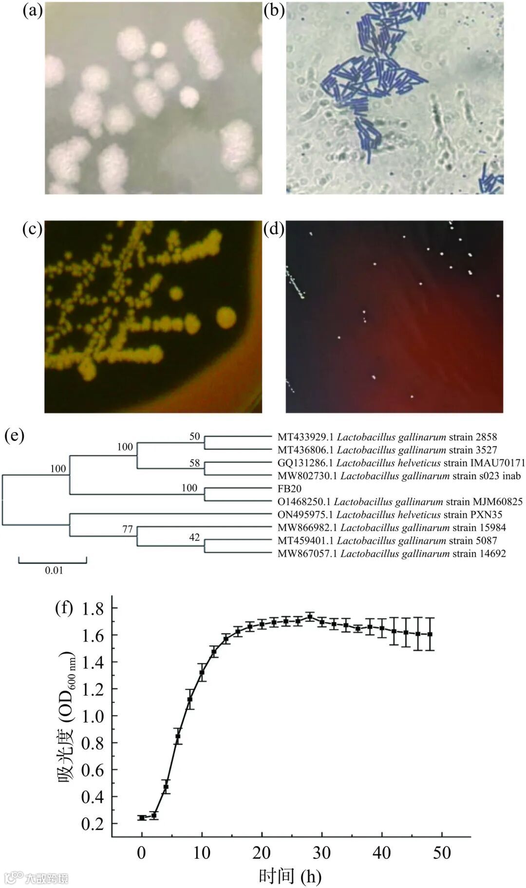 注:(a)鸡乳杆菌FB20在厌氧条件下培养的菌落形态图;(b)鸡乳杆菌FB20革兰氏染色后于光学显微镜下1000×观察图;(c)鸡乳杆菌FB20在CaCO3平板上的生长情况;(d)鸡乳杆菌FB20产β-葡萄糖苷酶能力;(e)鸡乳杆菌FB20系统发育树图;(f)鸡乳杆菌FB20生长曲线。