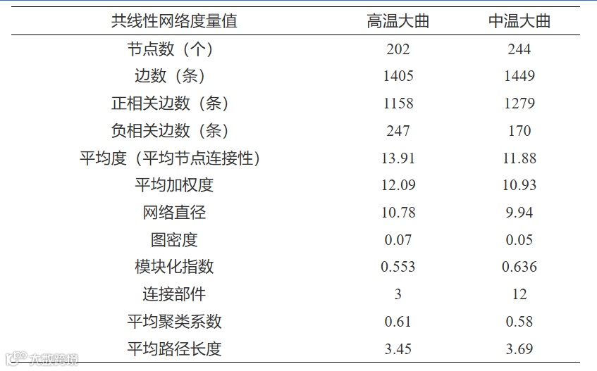 表 1 滨州地区高温和中温大曲基于属水平共线性网络图度量值