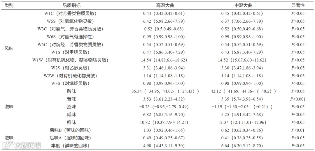 基于PCoA,本研究对高温和中温大曲之间风味和滋味品质进行了统计分析,结果如图6所示。