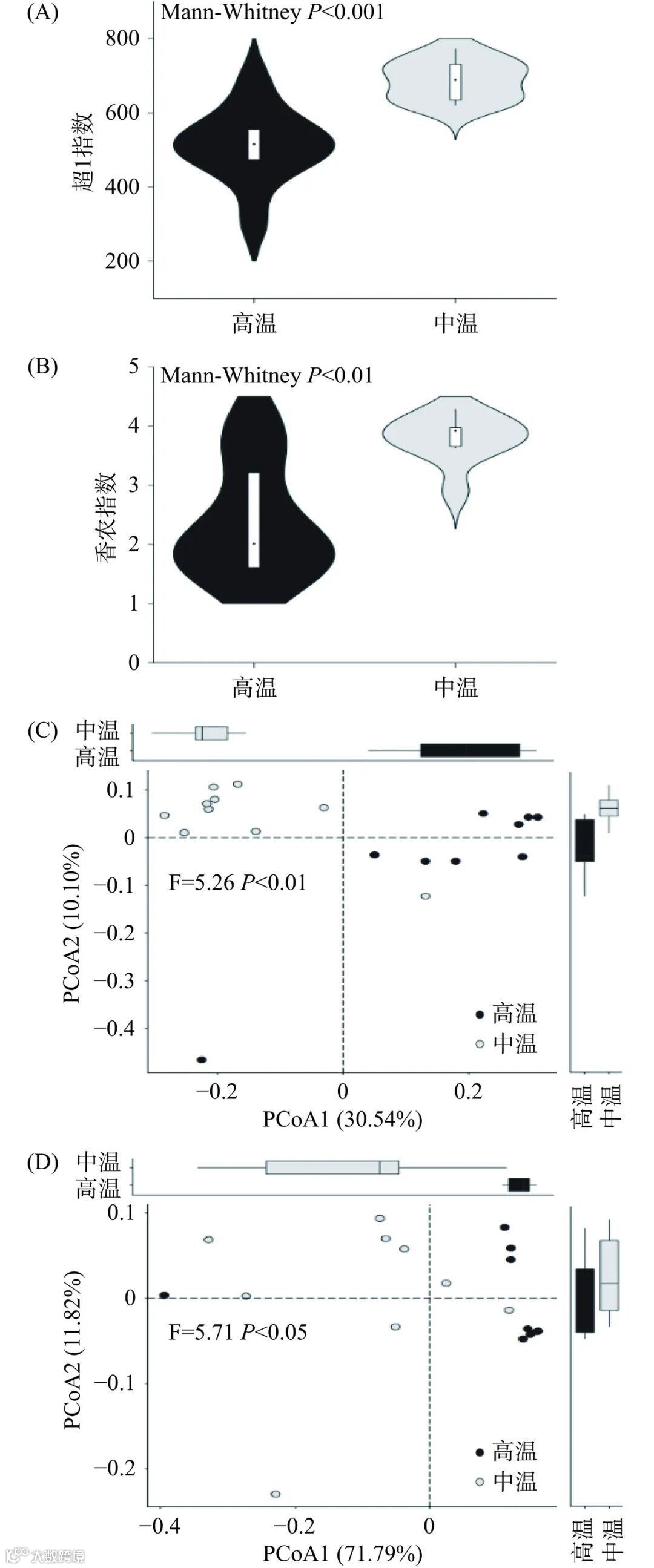 注:(A)超1指数;(B)香农指数;(C)基于非加权UniFrac距离PCoA;(D)基于加权UniFrac距离PCoA;P>0.05代表差异不显著,P<0.05代表差异显著,P<0.01代表差异非常显著,P<0.001代表差异极显著,图3~图7、表2同。
