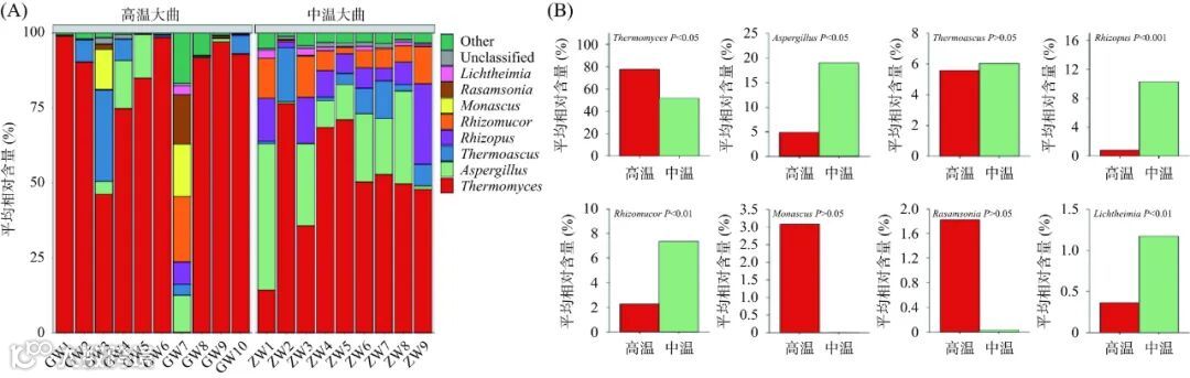 Figure 4. Analysis of community composition (A) and Mann-Whitney test (B) of the dominant fungi genera of high-temperature and medium-temperature Daqu in Binzhou region