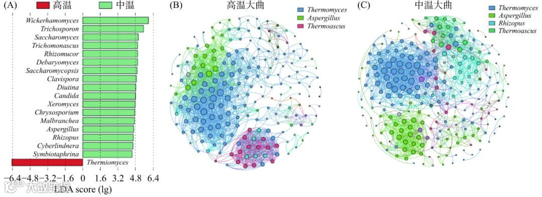 Figure 5. LEfSe analysis based on fungi genera (A) and co-occurrence network diagram analysis based on OTU (B and C) of high-temperature and medium-temperature Daqu in Binzhou region