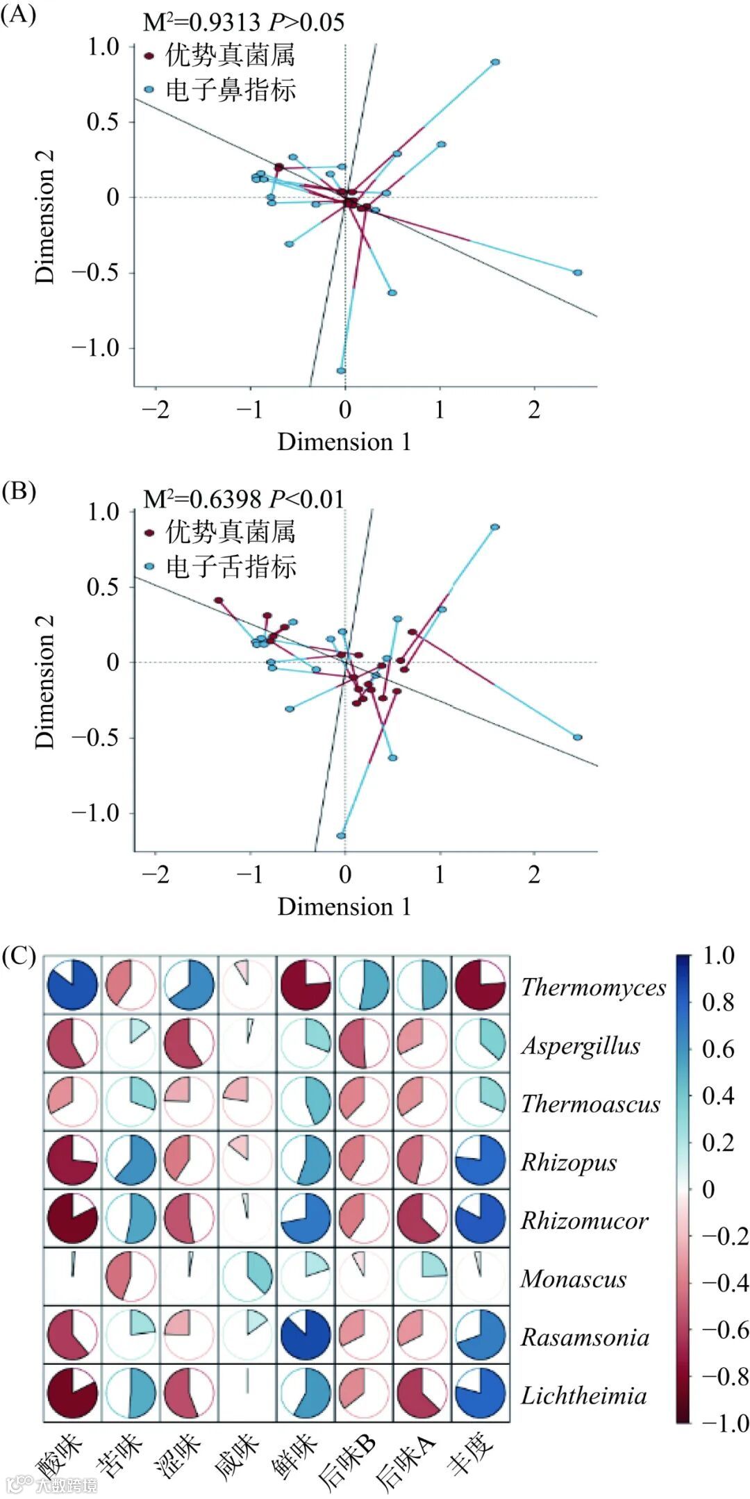 注:(A)优势真菌属与电子鼻指标普式分析;(B)优势真菌属与电子舌指标普式分析;(C)优势真菌属与电子舌指标相关性热图。