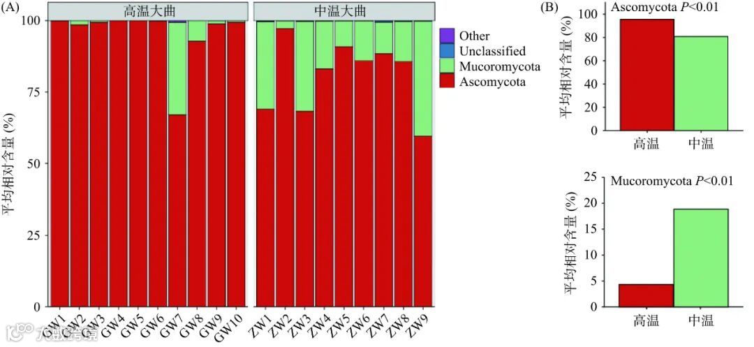 由图3(A)可知,子囊菌门(Ascomycota)和毛霉门(Mucoromycota)是两种大曲的优势真菌门,其在高温大曲的平均相对含量分别为95.59%和4.34%,在中温大曲的平均相对含量分别为80.90%和18.86%。由图3(B)可知,经过Mann-Whitney检验显示,高温大曲中Ascomycota的平均相对含量非常显著偏高(P<0.01),而Mucoromycota的平均相对含量非常显著偏低(P<0.01)。