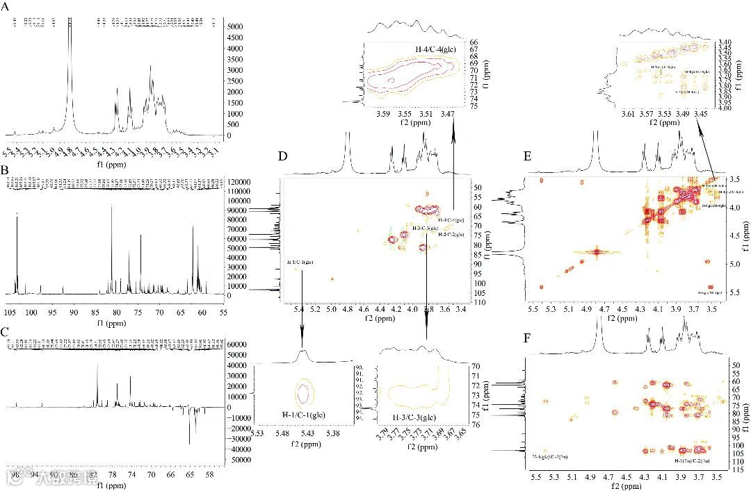 图 8 牛蒡中性多糖的1H 谱图(A)、13C 谱图(B)、DEPT-135 谱图(C)、HSQC 谱图(D)、1H-1H COSY 谱图(E)和 HMBC 谱图(F)