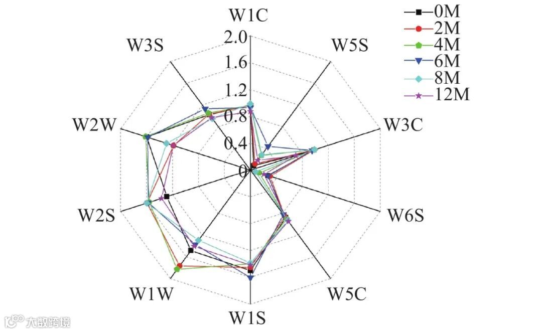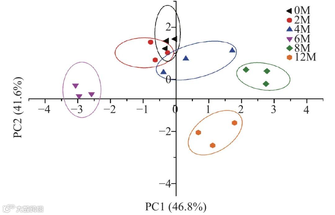 由PCA图(图3)可知,总贡献率为88.4%(PC1和PC2分别为46.8%和41.6%),说明不同发酵月份的老香黄样品间风味相互独立,整体区分度较好,PCA 方法适用于老香黄发酵期间的挥发性成分分析。发酵0、2、4个月样品在主成分2上较为接近,但它们与发酵6、8、12个月样品差异较大,且发酵6、8、12个月的样品在主成分1 上均有较明显的差异,说明总体上发酵0~4个月的老香黄挥发性组分差异小,而发酵6~12个月样品的挥发性组分差异大。由此可见,发酵6个月后老香黄的挥发性组分开始发生较大的变化。