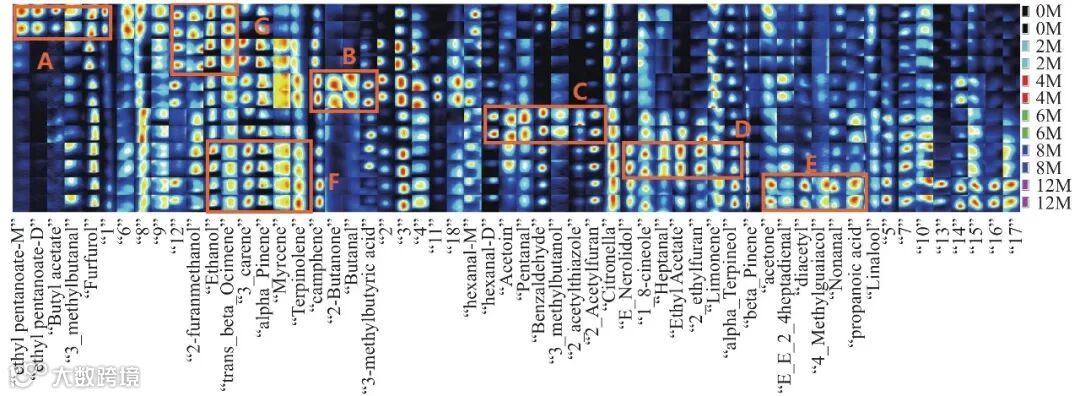 为进一步比较不同发酵时间老香黄挥发性成分的差异,采用GC-IMS仪器自带软件生成离子迁移指纹图谱(图8)。横轴为样品中检测出的所有挥发性成分,纵轴为不同发酵月份的老香黄样品。将指纹谱图分为A、B、C、D、E共5个特征峰区域和F、G共同区域。A区为发酵0个月样品的特征峰区域,包括的挥发性组分为戊酸乙酯、乙酸丁酯、异戊醛、糠醛。B区为发酵4个月样品的特征峰区域,包括的挥发性组分为莰烯、2-丁酮、正丁醛、异戊酸。C区为发酵6个月样品的特征峰区域,包括的挥发性组分为己醛、3-羟基-2-丁酮、戊醛、异戊醇、2-乙基呋喃、2-乙酰基呋喃。D区是发酵8个月样品的特征峰区域,主要包括反式-橙花叔醇、桉叶油醇、庚醛、乙酸乙酯、2-乙基呋喃、柠檬烯、α-松油醇共8种挥发性组分。E区为发酵12个月样品的特征峰区域,包括的挥发性组分为β-蒎烯、2,3-丁二酮、4-甲基愈创木酚、壬醛、丙酸。G区为发酵0个月和2个月的共同区域,已知的挥发性组分包括呋喃甲醇、乙醇、反式-β-罗勒烯;F区为发酵8个月和12个月的共同区域,包括乙醇、反式-β-罗勒烯、3-蒈烯、α-蒎烯、月桂烯、萜品油烯共6种挥发性组分。结合表3可知,发酵前期,呋喃甲醇、乙醇、反式-β-罗勒烯均为最高值;随着发酵时间的延长,三者含量均呈稳定的下降趋势;而3-蒈烯、α-蒎烯、月桂烯、萜品油烯含量在发酵前期显著增加,之后下降,并在发酵8个月后再次升高。2-乙基呋喃、2-乙酰基呋喃、反式-橙花叔醇随着发酵时间的延长含量逐渐增多。这些挥发性成分的生成可能是由于美拉德反应和氨基酸与脂质的相互作用有关。
