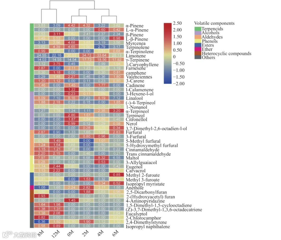 图 6 不同发酵月份的老香黄挥发性组分聚类分析热图