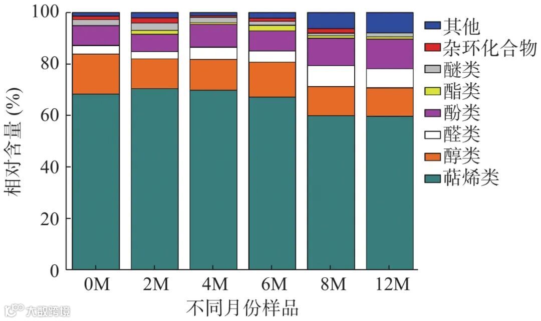 不同发酵时间的老香黄挥发性成分的总离子流图(TIC)如图4所示,老香黄在不同发酵阶段共鉴定出46种挥发性物质,包括萜烯类、醇类、醛类、酚类、酯类、醚类、杂环化合物和其它共8个种类,具体挥发性成分种类和相对含量见图5和表2。其中,α-蒎烯(3.87%)、β-蒎烯(2.89%)、月桂烯(3.73%)、萜品油烯(3.75%)、柠檬烯(28.87%)、异松油烯(16.21%)、1-石竹烯(1.66%)、巴伦西亚橘烯(1.11%)、芳樟醇(7.65%)、α-松油醇(1.83%)、糠醛(1.92%)、麦芽酚(7.22%)、茴香脑(1.90%)和2,4-二甲基苯乙烯(1.25%)是不同发酵时间的样品中平均含量较高且相对稳定的14个共有成分。基于此,这些成分可以作为老香黄发酵期间的目标参考化合物。