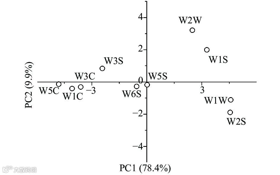 在荷载分析图中,各传感器的坐标可以精准地反映其对样品挥发性气味贡献率的大小;离原点越远,传感器对主成分的贡献越大,反之则越小。由图2可知,W2W、W2S、W1S 和W1W(分别对芳香成分、醇类、醛酮类、甲基类化合物和有机硫化物灵敏)离中心原点较远,W1C、W3C、W3S和W5C(分别对苯类、氨类、长链烷烃、短链烷烃灵敏)次之,距离最近的是W6S和W5S(分别对氢化物和氮氧化合物灵敏)。结合香气分布雷达图说明,芳香成分、醇类、醛酮类、甲基类化合物和有机硫化物对老香黄样品香气贡献率最大,而苯类、氨类、长链烷烃、短链烷烃次之,贡献率最小的是氢化物和氮氧化合物。