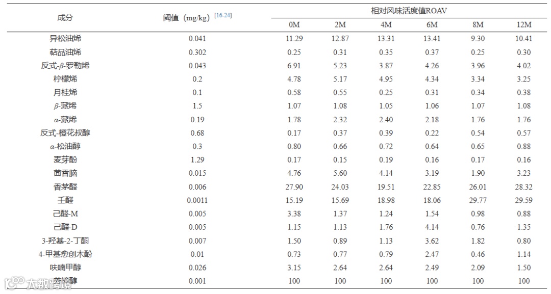 综合定性结果,对每个阶段均检测出的化合物香味阈值进行查询并计算。本研究中检测到芳樟醇物质,虽然含量较低,但根据佛手挥发性风味的相关文献报道,柠檬烯、异松油烯等萜烯化合物和芳樟醇是佛手的重要香气物质。这类物质的风味阈值低,清香味强烈。故定义芳樟醇的ROAV 为100,其他风味成分的ROAV由式(1) 计算得出。选择其中ROAV>0.1 的成分列出,如表4所示。