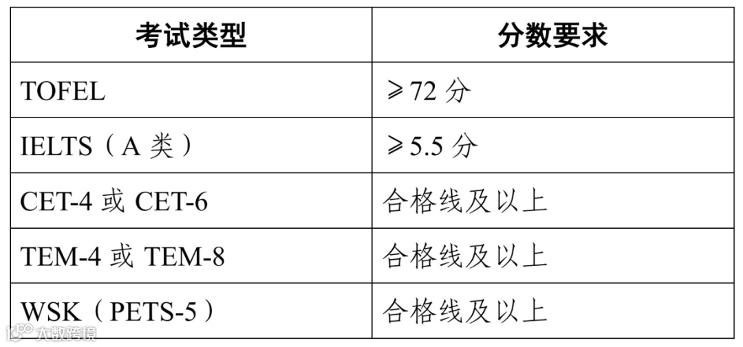 TOFEL、IELTS(A类)、全国大学英语考试(CET-4或CET-6)、国家英语专业考试(TEM-4或TEM-8)、全国外语水平考试(WSK,PETS-5)。