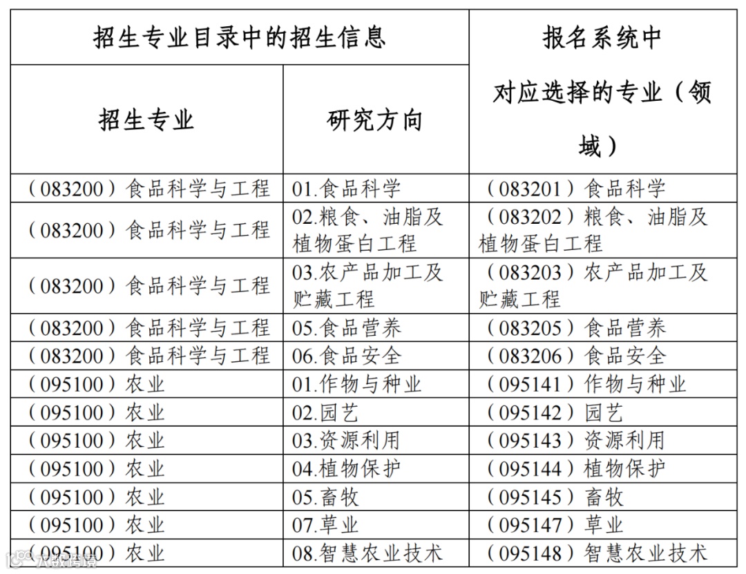 2.中国农业科学院2025年新增(0832)食品科学与工程博士学术学位授权点与(0951)农业博士专业学位授权点,2025年均按照一级学科/学位类别进行招生,一级学科/学位类别下设研究方向。在博士报名系统中,根据不同的研究方向,需选择对应的专业(领域)进行报名(见下表):