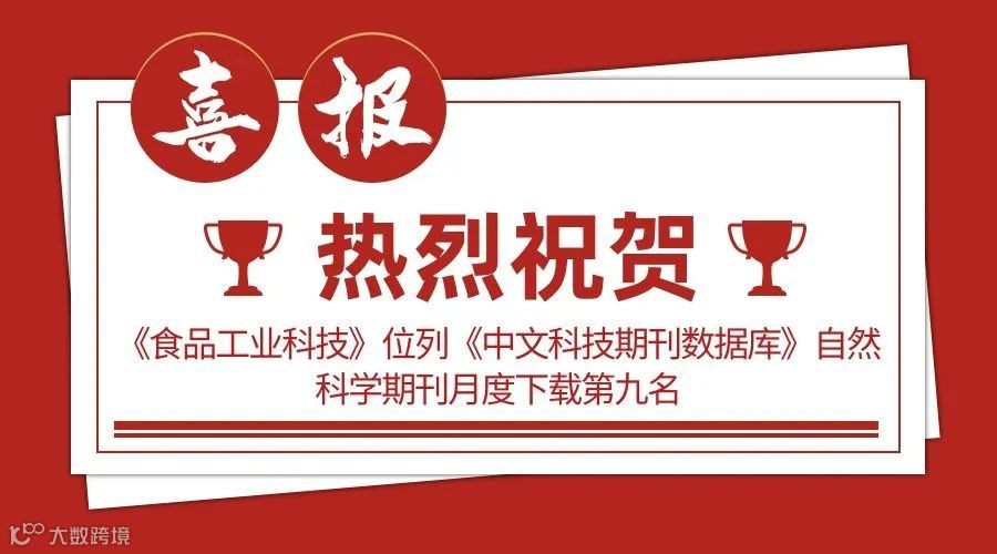 2024年10月9日,《中文科技期刊数据库》自然科学期刊月度下载排行榜公布,其中《食品工业科技》在9月下载榜单中,位列第九名,同时位列“食品科学”类第二名,此结果不仅仅表明了《食品工业科技》的论文质量及影响力,更体现了食品学科的繁荣交流及发展。