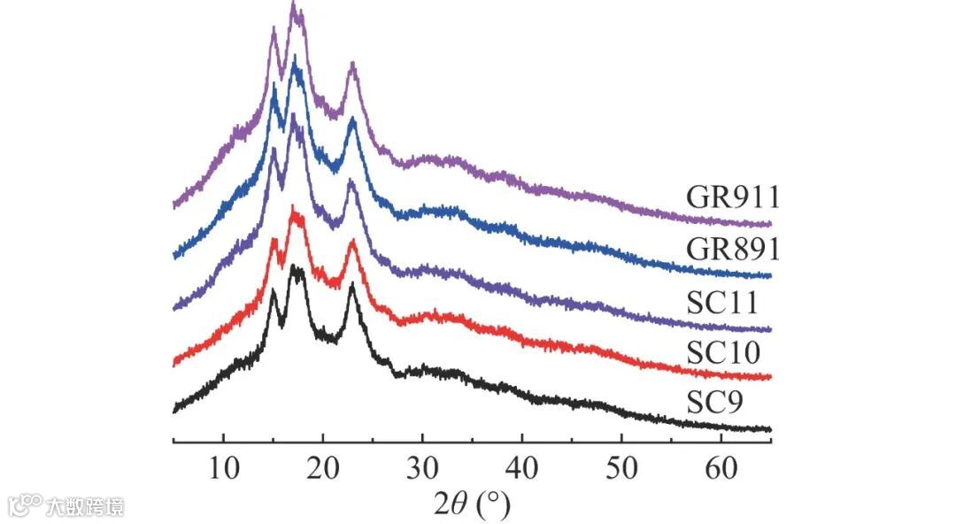 图 3 五个品种木薯淀粉的X射线衍射图