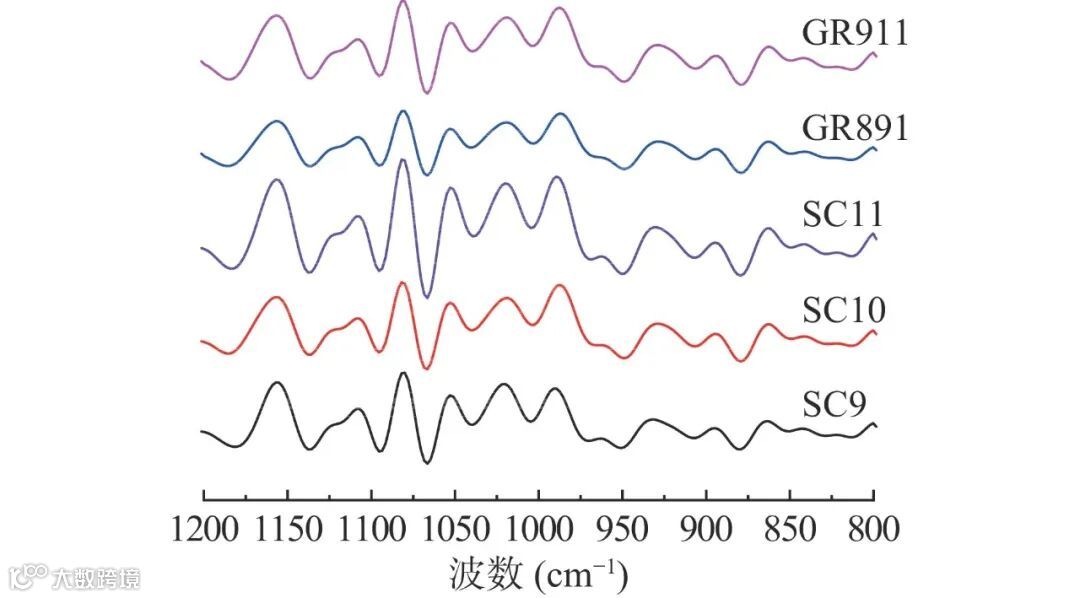 图 4 五个品种木薯淀粉的红外光谱