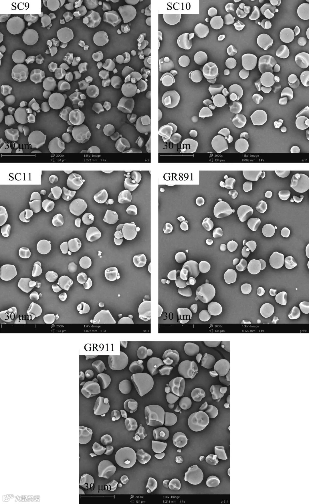 图 1 五个品种木薯淀粉扫描电镜