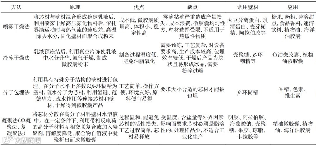 微胶囊的制备技术,其关键点在于微胶囊壁材和制备方法的探究,制备方法的选择与微胶囊壁材的性质密切相关,且因目标功能和应用场景的多样,所以在实际生产中应根据壁材与芯材的性质特点、应用场景等因素综合考虑,选择合适的方法。