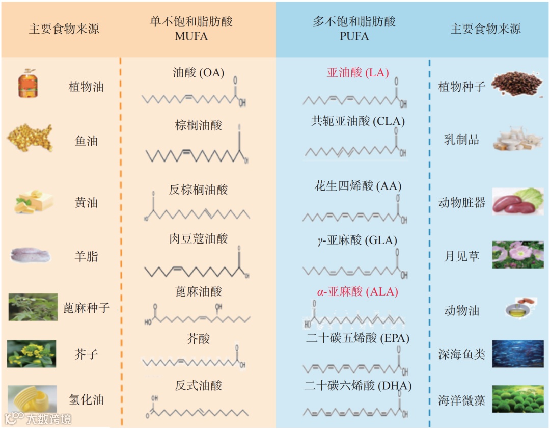 图2 不饱和脂肪酸种类及其主要来源示意图